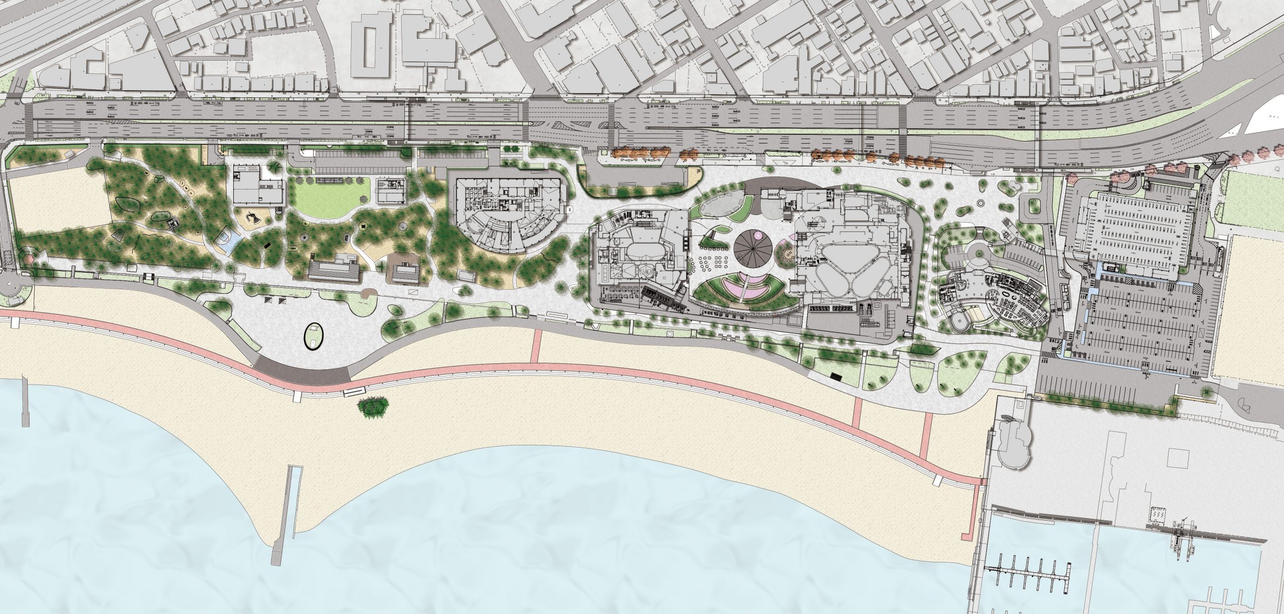 また既存ホテルを東から西に配置変更し、多目的広場を確保しつつ中央部に「すまっこ広場」を計画し、その周辺をにぎわい施設を配置することで市民の公園として海岸へのアクセスを含めた回遊性を高める配置計画とした。