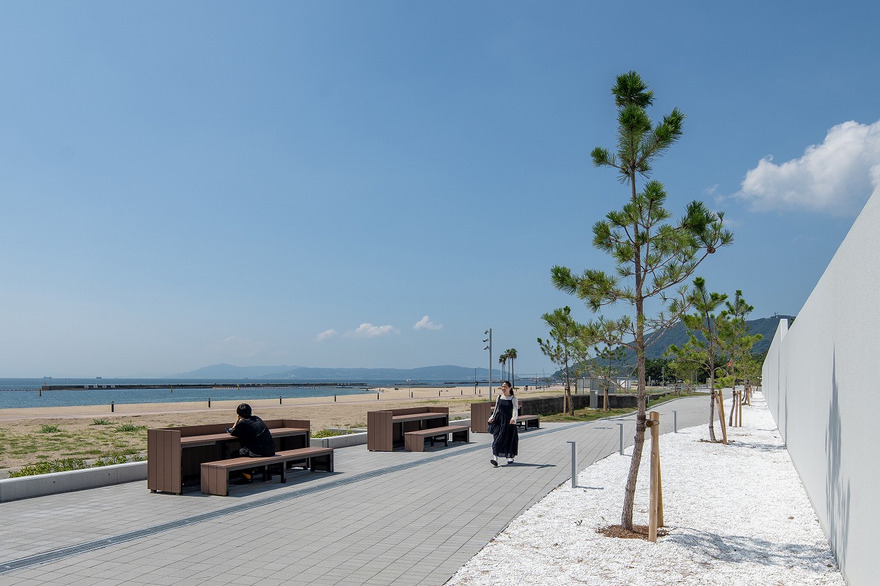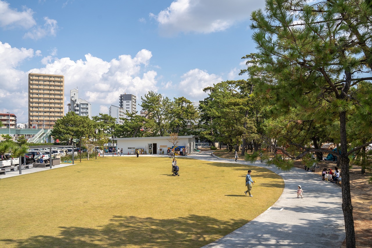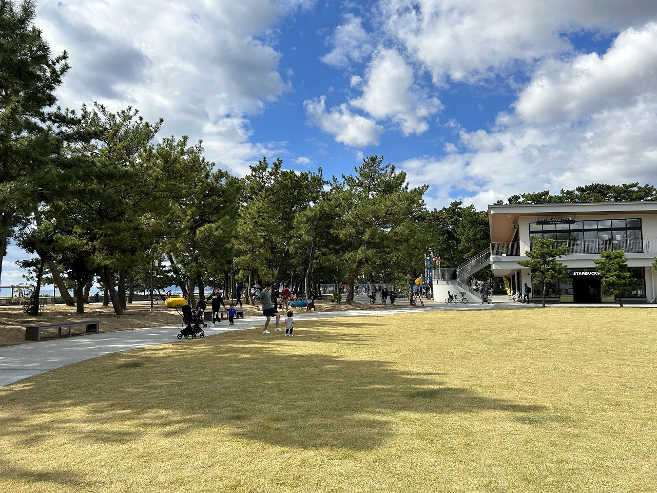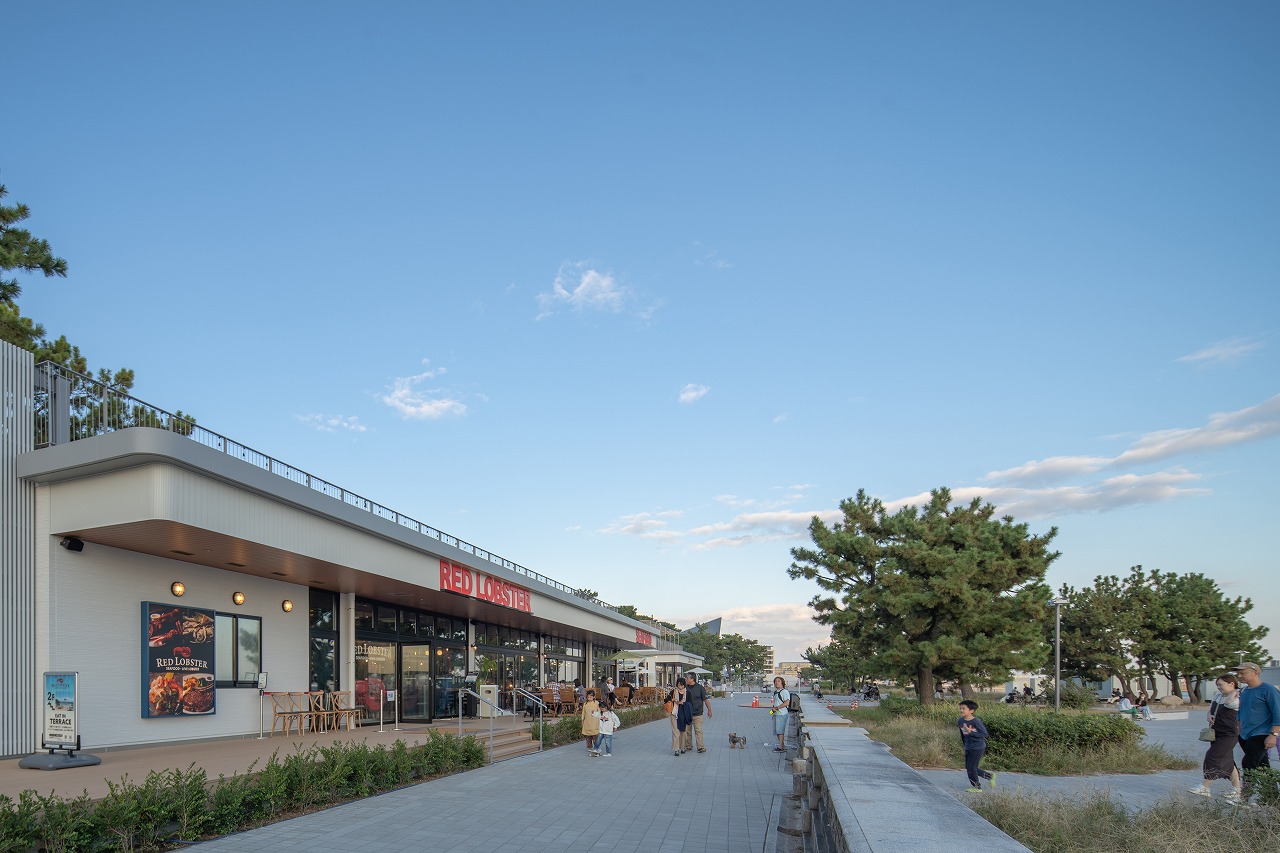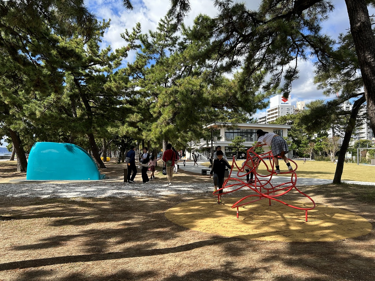 また、これまでになかった3棟の飲食施設の配置、回遊性やインスタ映えに寄与するモニュメントを配置することで来園者の回遊性を高めている。さらに、隣接する港湾エリアと公園エリアを一体的に整備することで、海岸というポテンシャルを生かす海浜公園となった。