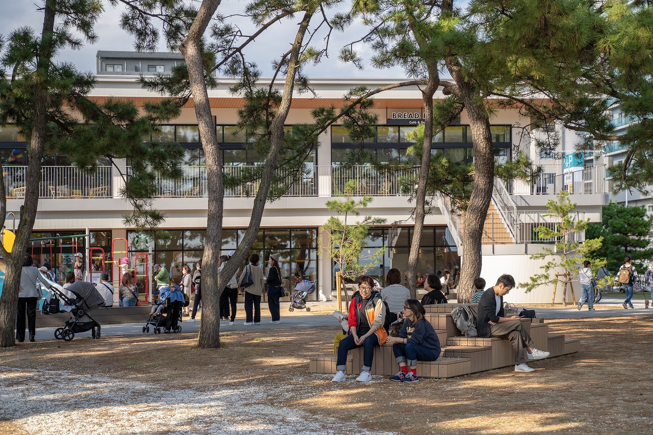 従前の機能刷新としては、子供たちが球技等の練習ができるコミュニティ広場、カフェと隣接したすまっこ広場(芝生広場)、松林の中にある遊具等の機能の刷新を行った。