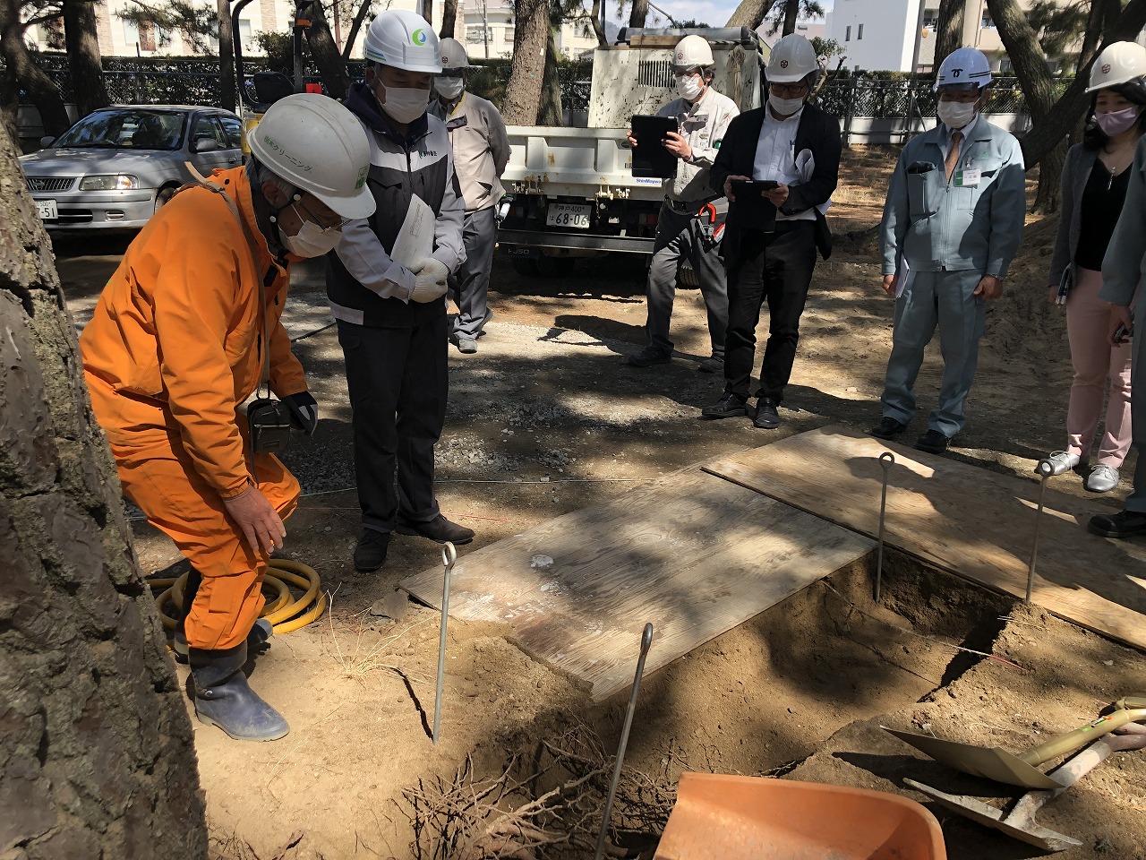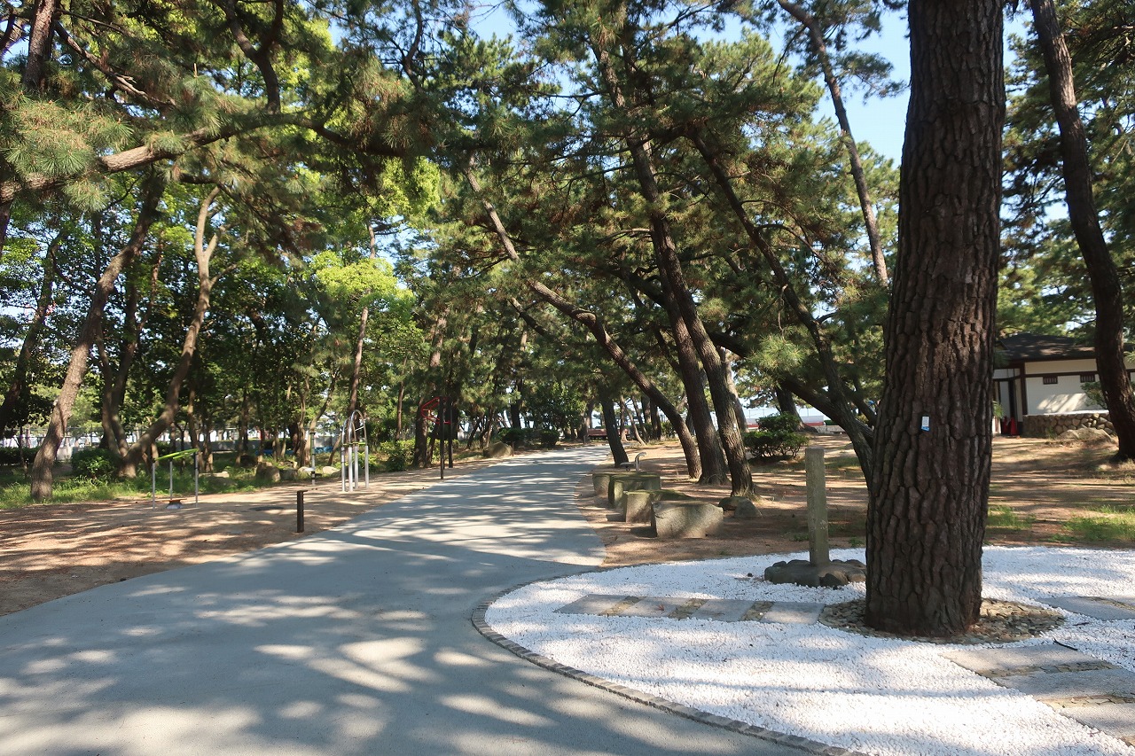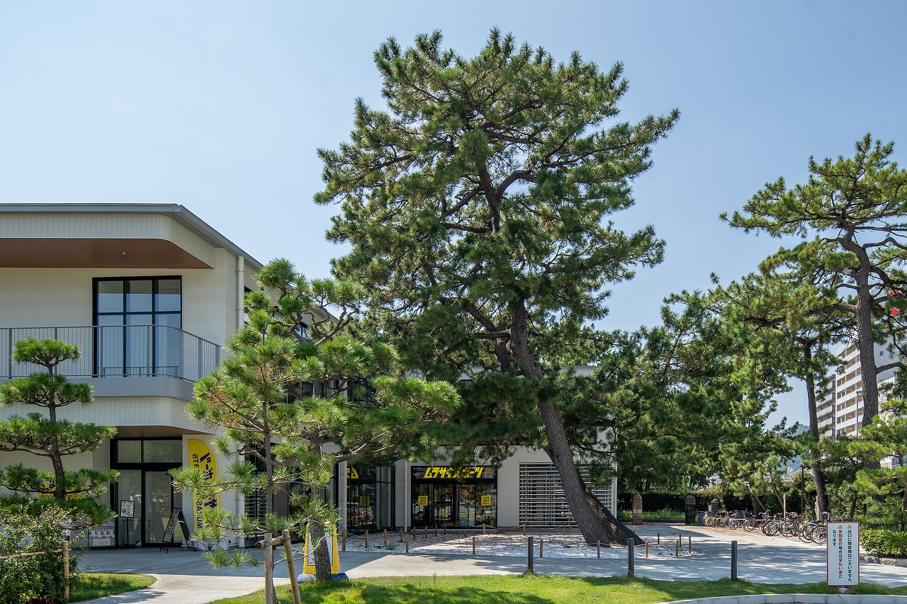 本整備事業の命題でもあった既存の保全対象松(528本)の70%以上を残しつつ、水族館等の大規模建築物を配置する必要があった。保全を行う既存松については根系の調査を行い、可能な限り松の根に影響を与えないように遊具等の配置を現場にて検討を行った。また、移植(32本)と新植(80本)を行い、結果的には整備前と同等の松の本数を植栽し、白砂青松の風景の継承を行った。