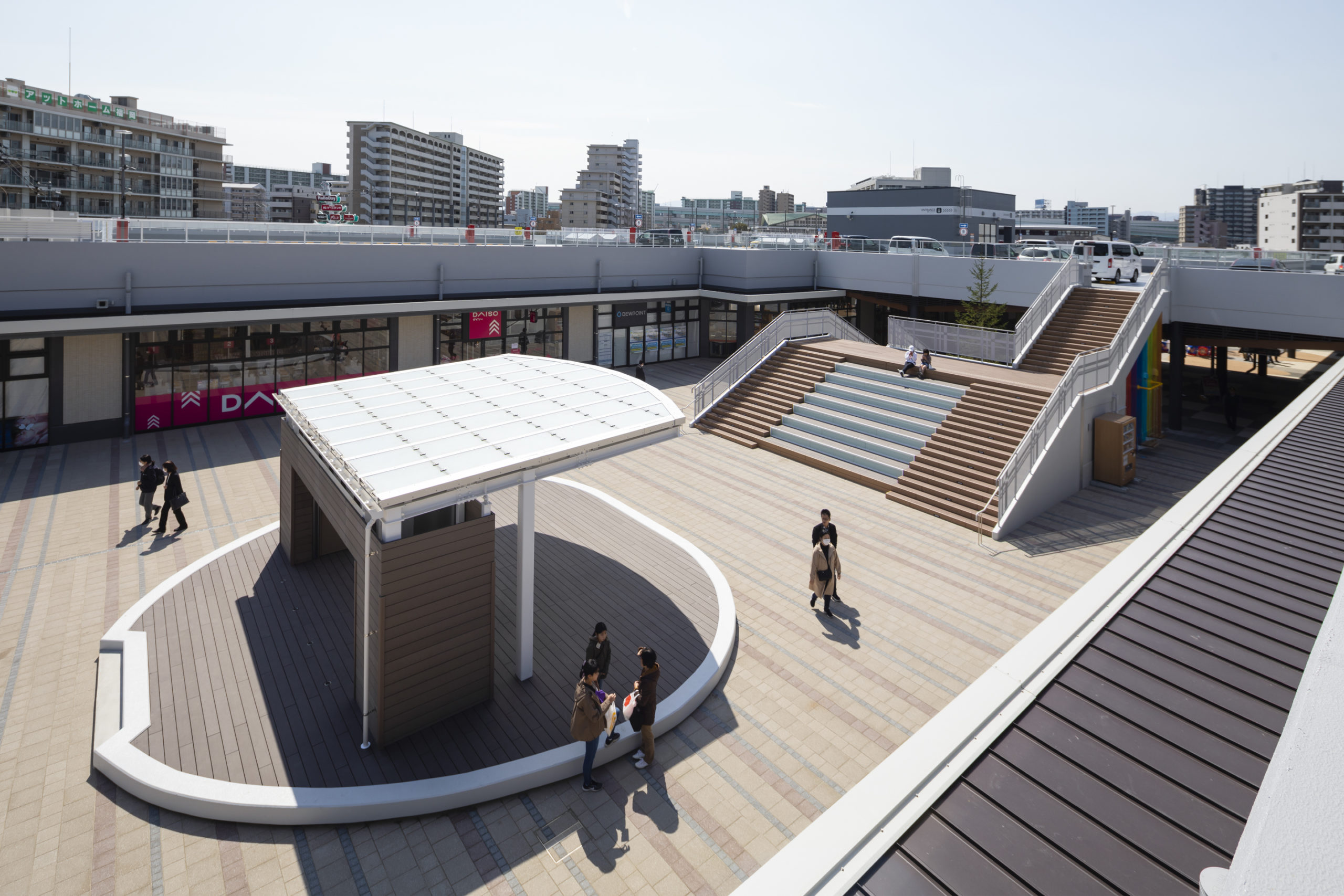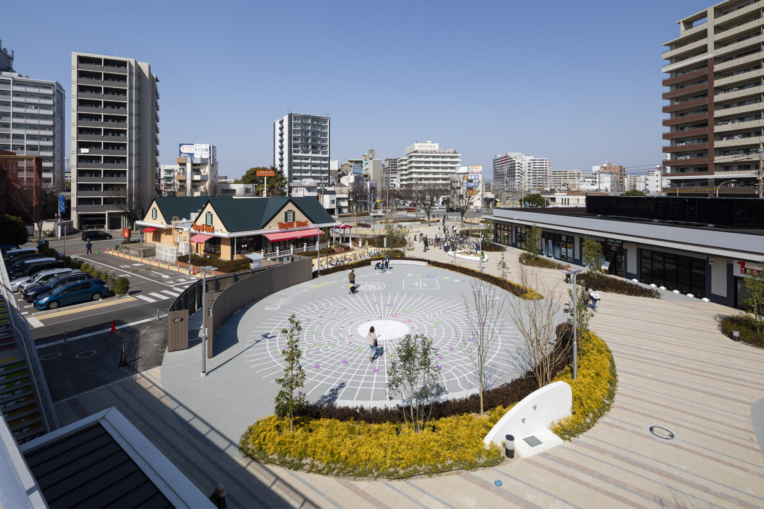 本計画はJR博多駅から北へ一駅隣に位置するエリアにある商業施設「パピヨンプラザ」の建替計画である。地域のための商業施設「都会のパティオ(中庭)」を事業コンセプトとし、商業施設の駐車場を敷地南西部にまとめ、歩車分離をすることで安心安全な緑豊かな商業施設をつくり上げている。