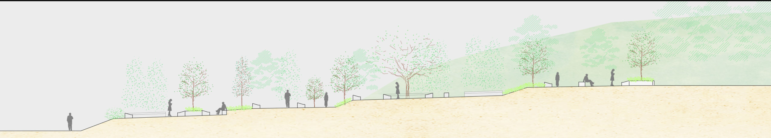 2期計画地は周囲を従来型普通墓地に囲まれ、まちの眺望へ向かう細長い敷地形状と長手方向に約4mの高低差がある傾斜が特徴的であった。そこで緑に囲まれ、空とまちを眺めながら故人と共に過ごす場所として、レベル差を生かしたカスケード庭園型の樹木葬墓地を提案した。