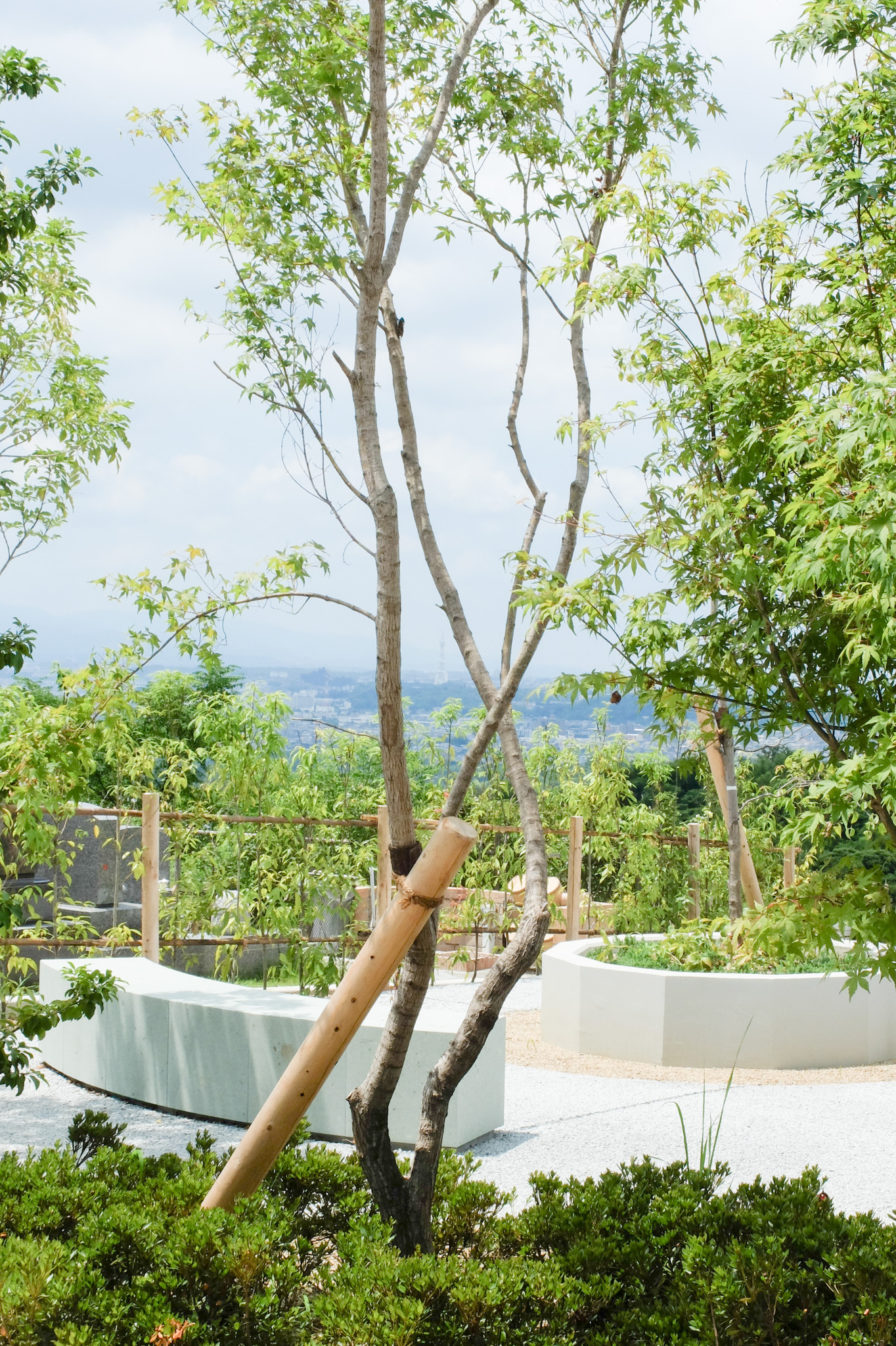 隣接する従来型普通墓地の通路を延長するように軸線を通しているため、普通墓地の参拝者も何気なく公園を散歩するように樹木葬の森の中を回遊することができる。また、来訪者が休憩できるベンチを墓石と一体で点在させることで、故人と共に景色を眺めたり、四季を愛でたり、思い出を語らう憩いの場を設けている。